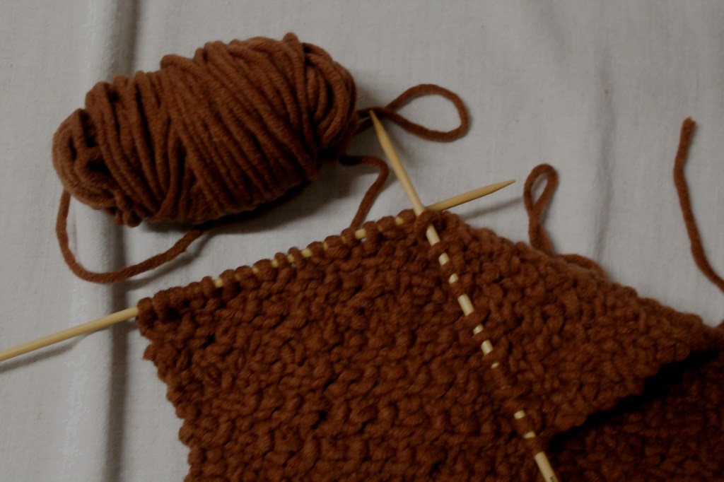 I was knitting completely voluntarily. I had began a scarf in my favorite shade of brown a year ago, and wanted to finish it before winter.