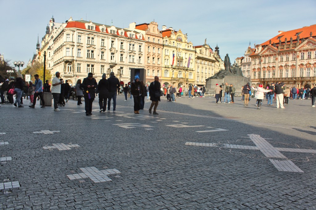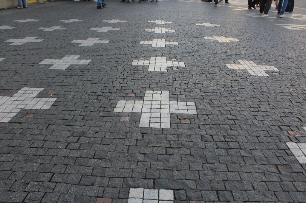 Next to the town hall with its famous astronomic clock (that truly is beautiful to watch), there are 28 white crosses put into the pattern of the pavement. To be honest, the first time I walked above them, I did not even register that this might be a monument of some kind, because the pavement across the city often displays beautiful patterns.